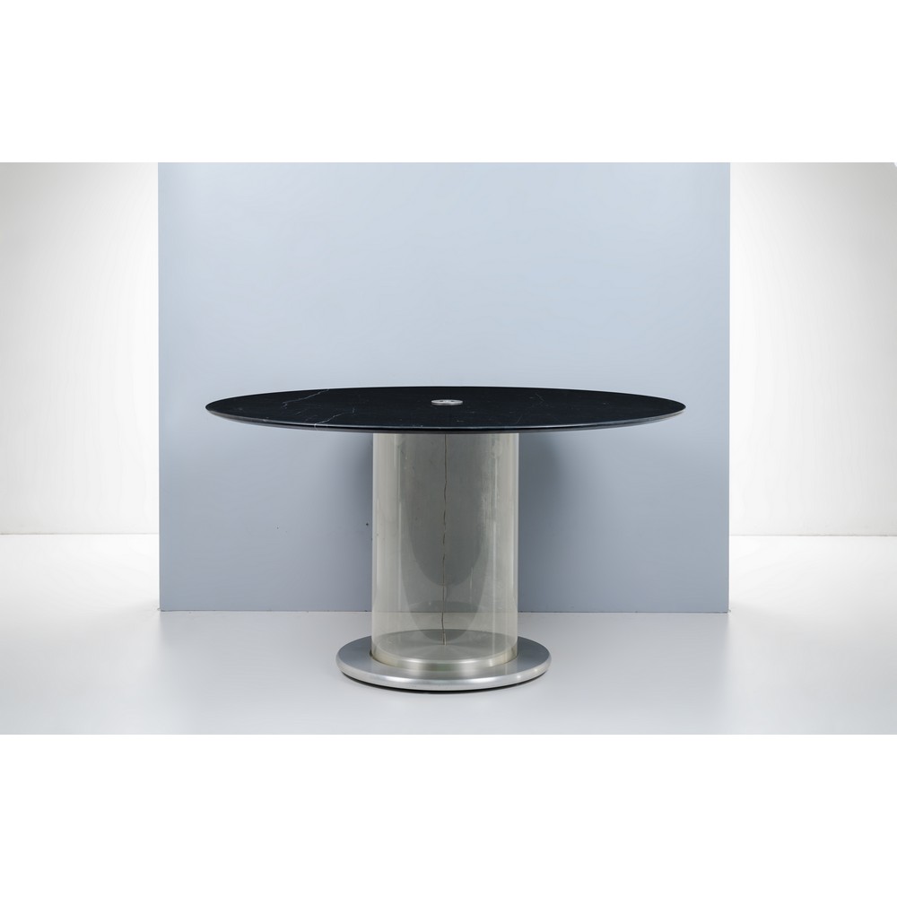 Tavolo da pranzo modello "Ellisse", piano circolare in marmo nero, piede cilindrico in plexiglass incolore e trasparente, fusione di alluminio. Segni di uso.