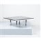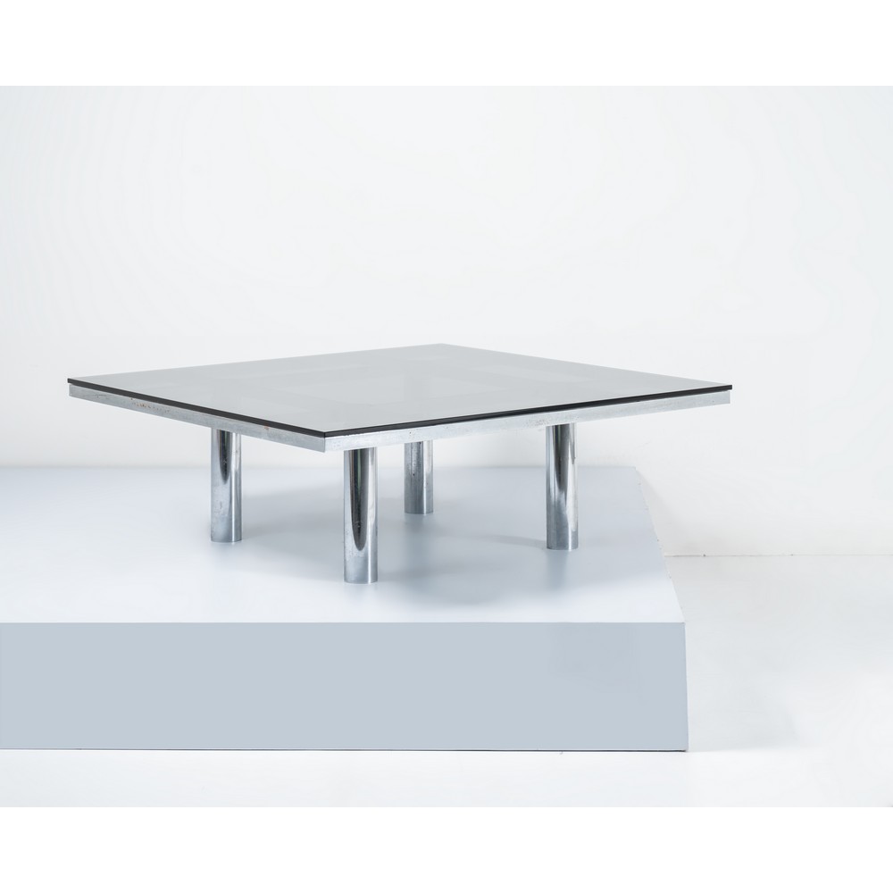 Un tavolo basso modello “Andrè”, struttura in acciaio cromato, piano di forma quadrata in vetro fumè. Etichetta di produzione.