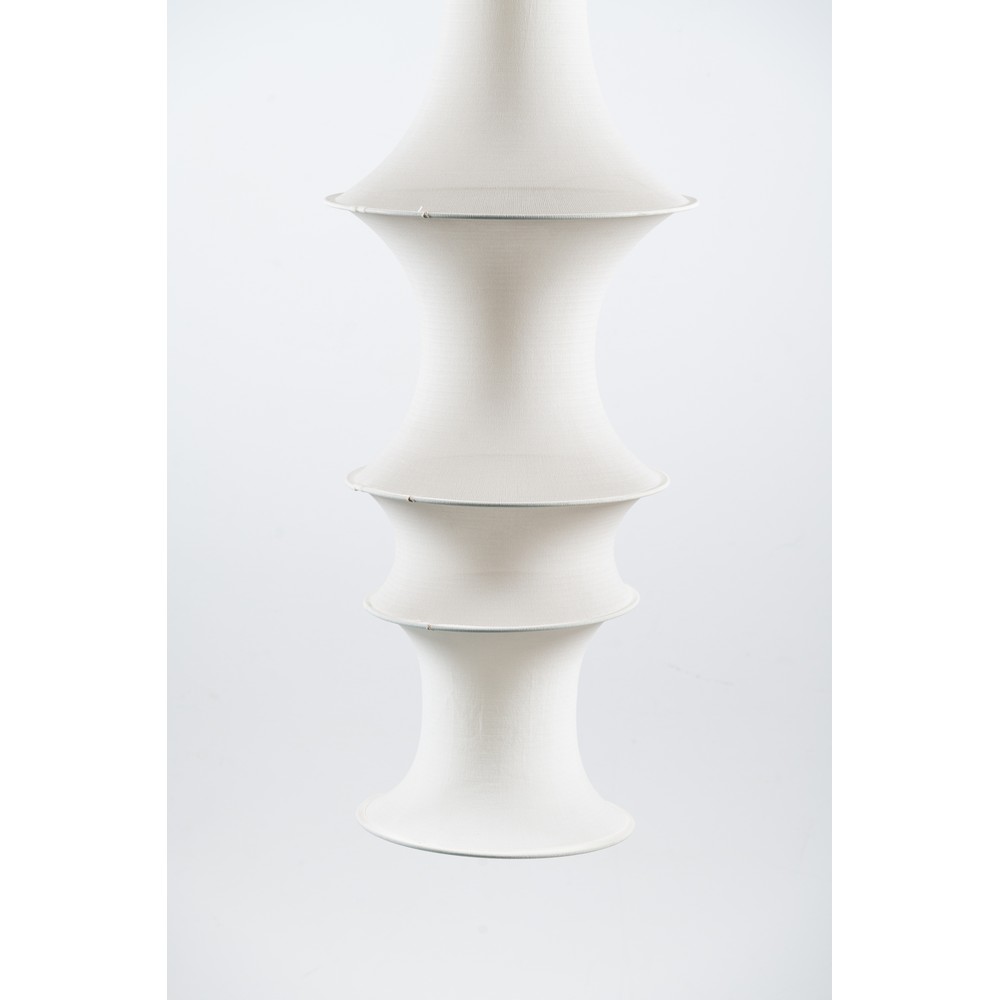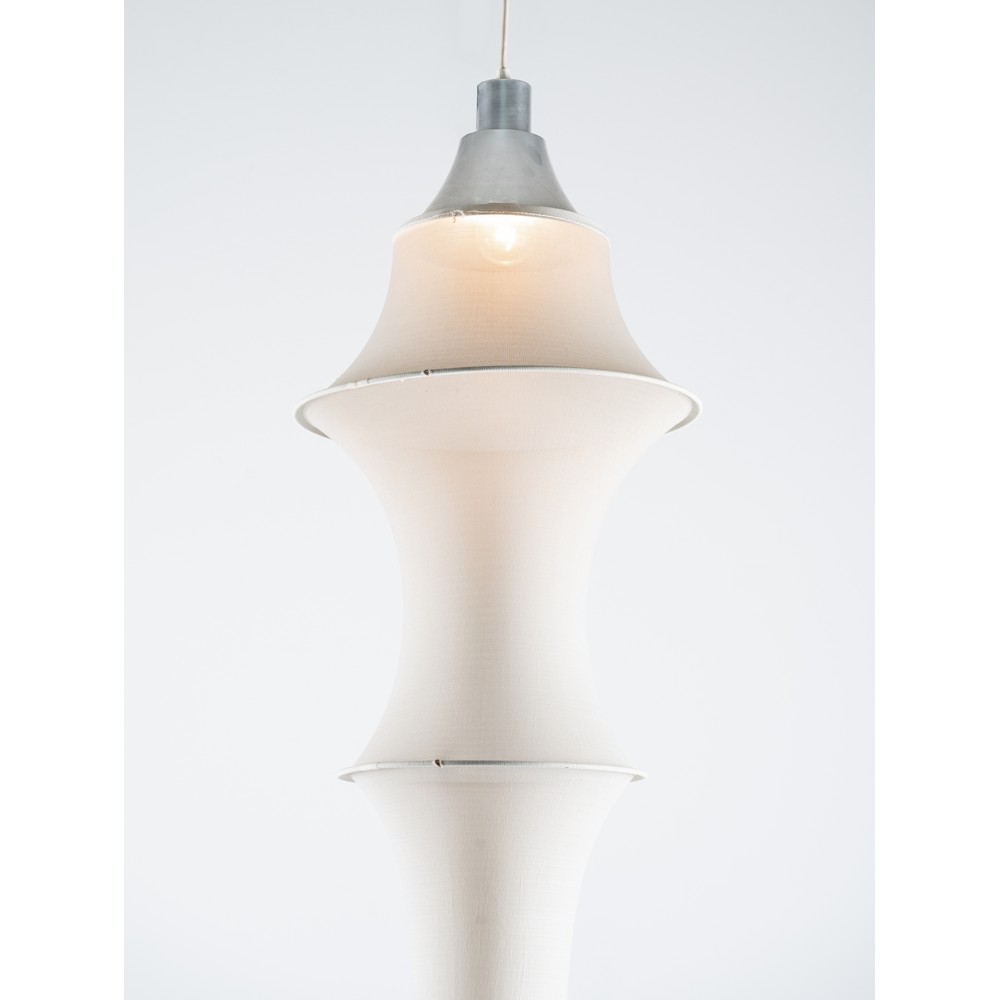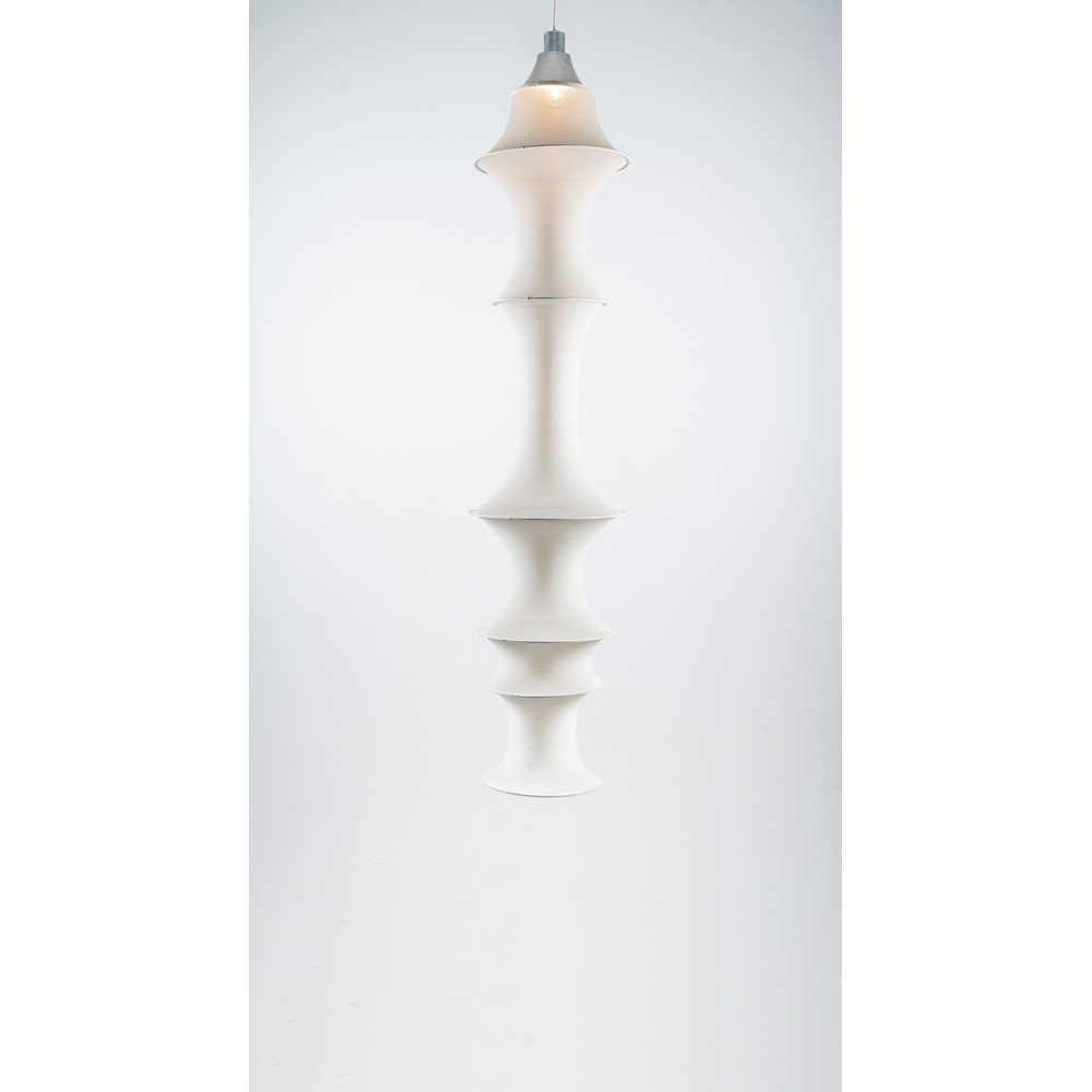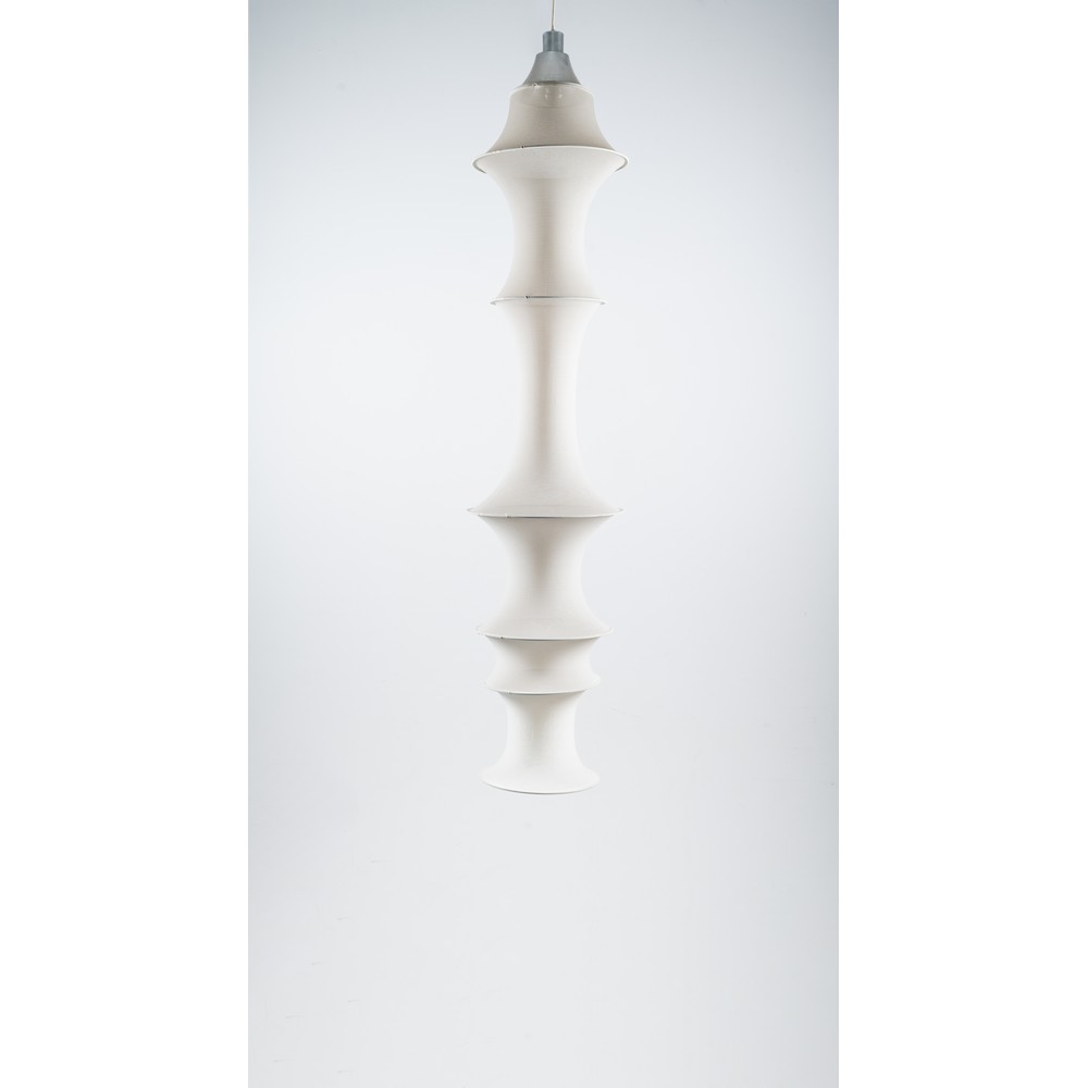 Lampada a sospensione ad una luce modello ”Falkland”, corpo cilindrico sagomato, metallo, tessuto elastico tubolare, anelli metallici.