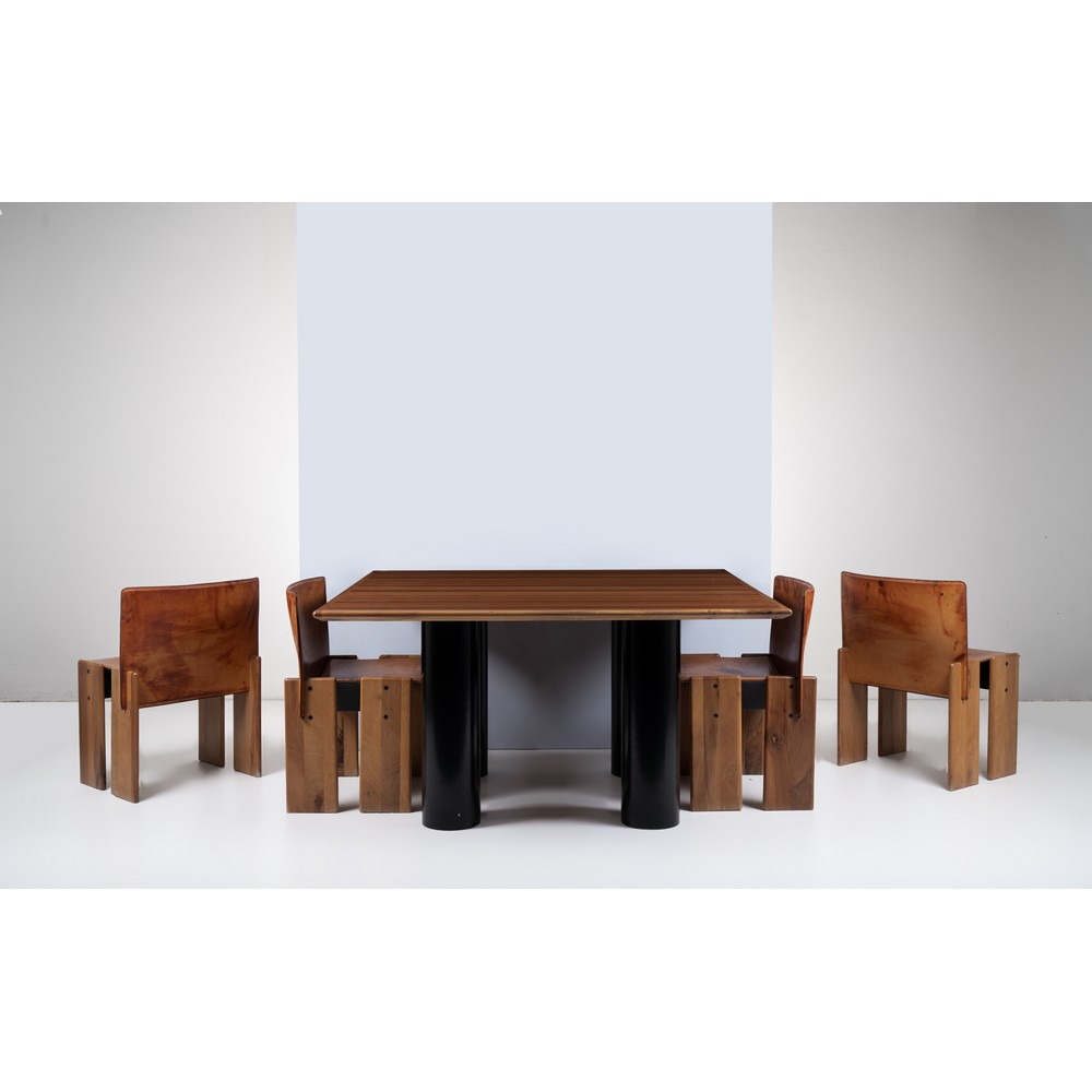 Quattro sedie da pranzo modello "Avila" struttura in noce chiara con seduta e spalliera in pelle cognac, minuterie in metallo. Segni di uso. Un tavolo da pranzo con piano quadrato in noce chiara, gambe cilindriche in legno laccato nero.