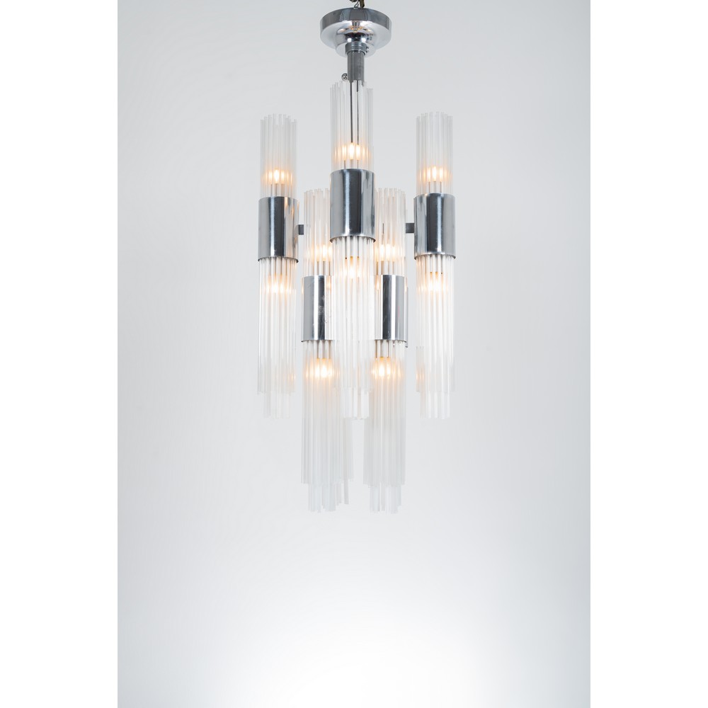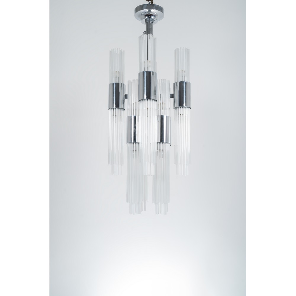 Lampada a sospensione a sedici luci, struttura in acciaio cromato, fusto regolabile in altezza, diffusore cilindrico composto da cannucce di vetro incolore e satinate.