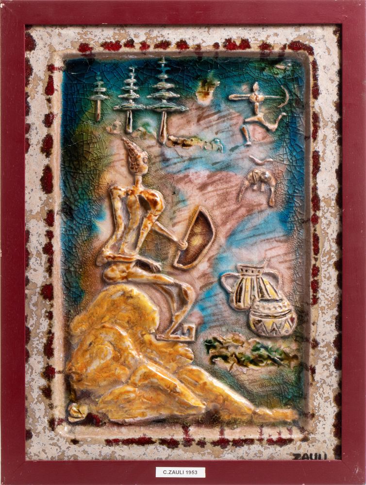 Ceramica decorata in altorilievo e dipinta in policromia. Firmato in basso a destra: Zauli