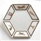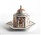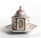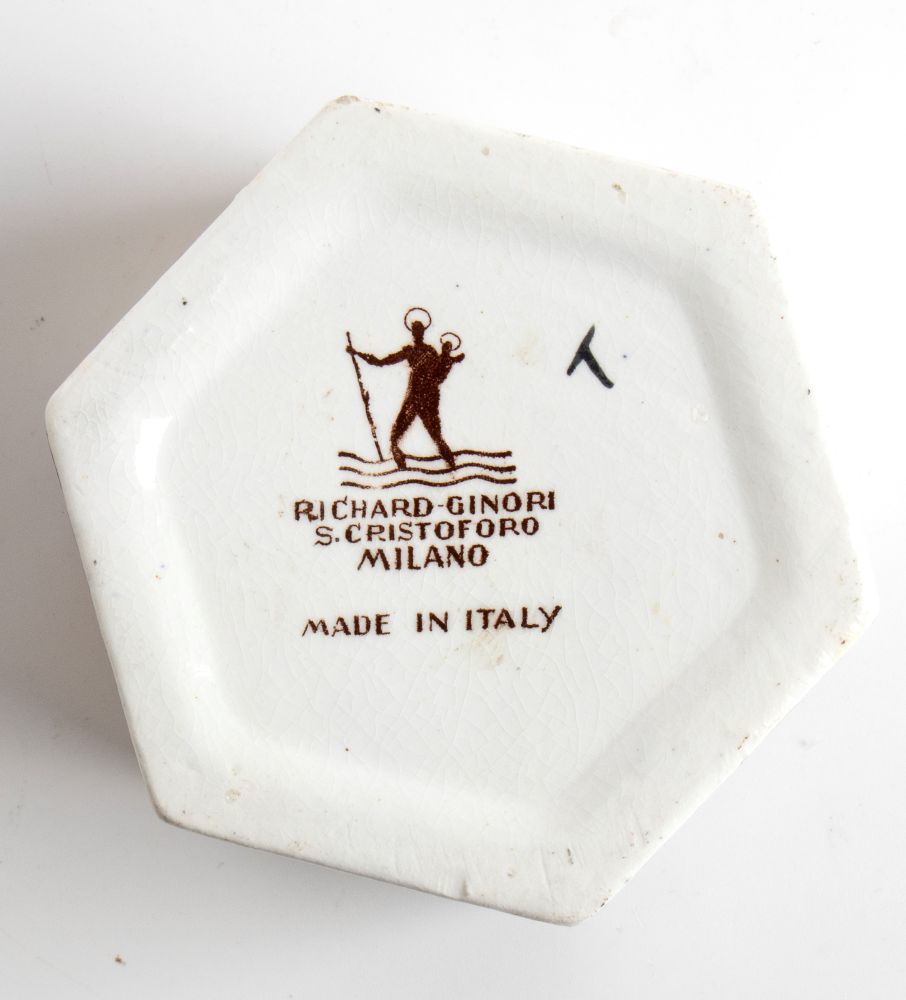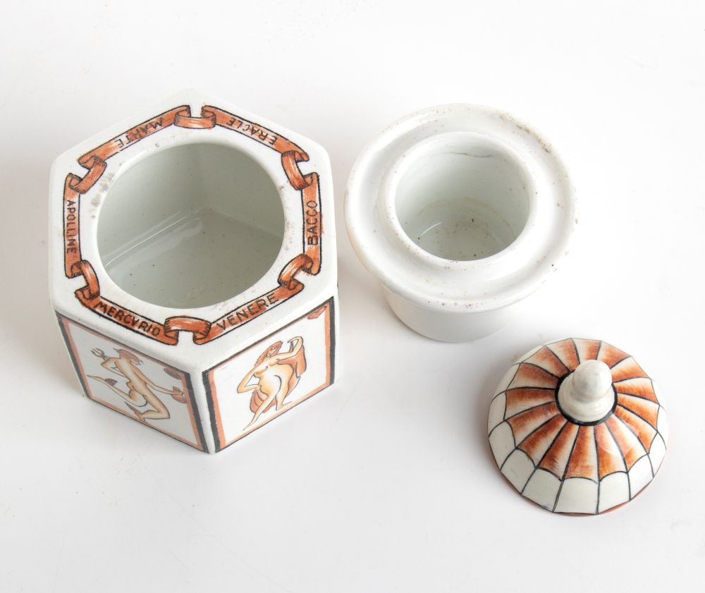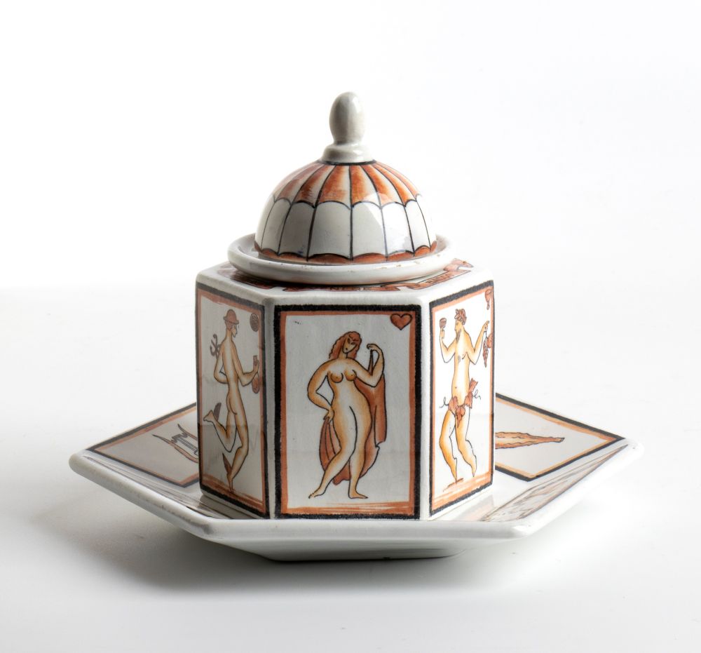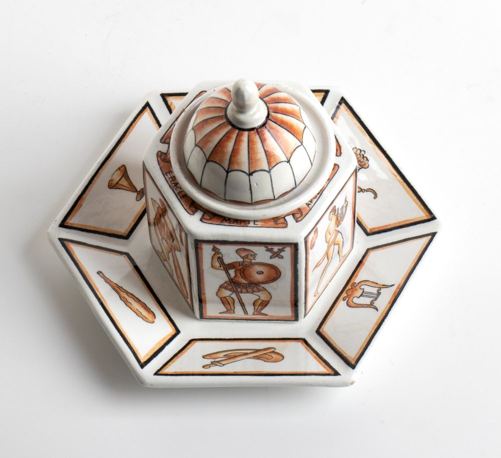 Calamaio in terraglia forte a colaggio a sezione esagonale con serbatoio, piatto e coperchio decorato con figure, nomi e simboli di sei divinità del pantheon olimpico su fondo bianco e sulle tonalità del marrone. Timbro sotto la base del calamaio: Richard-Ginori, S. Cristoforo, Milano; titolo e anno sotto la base del piattino: Per scriver classico, 1923