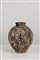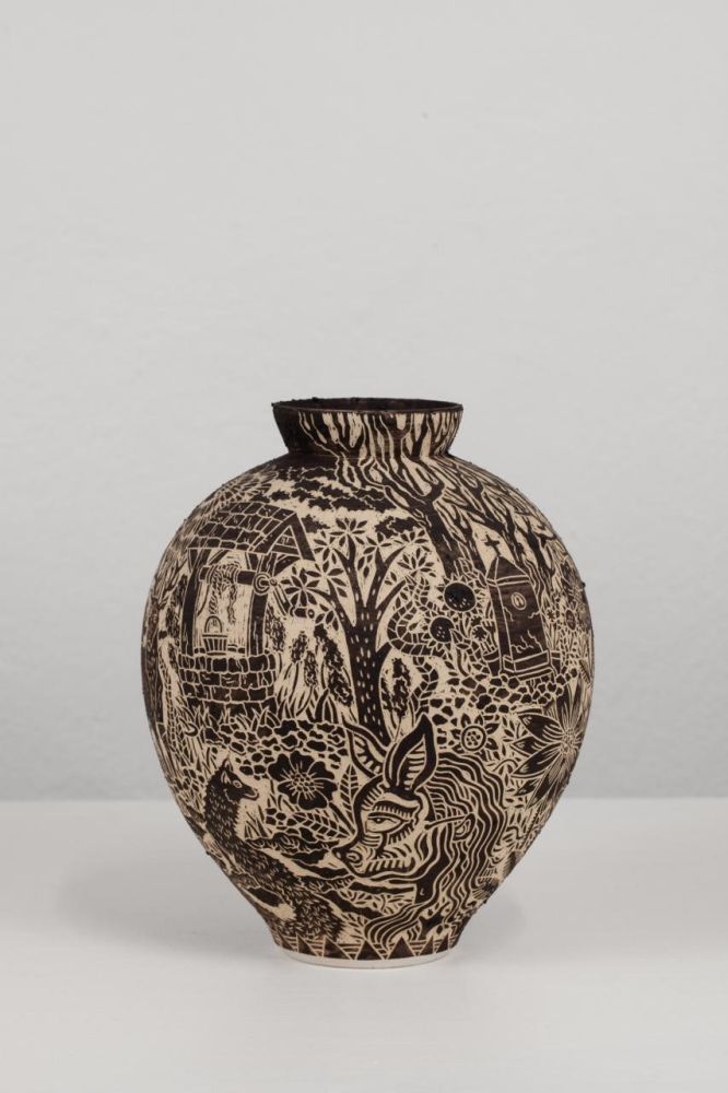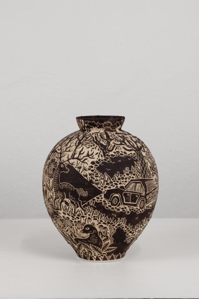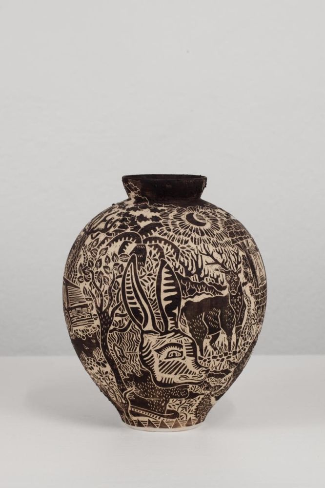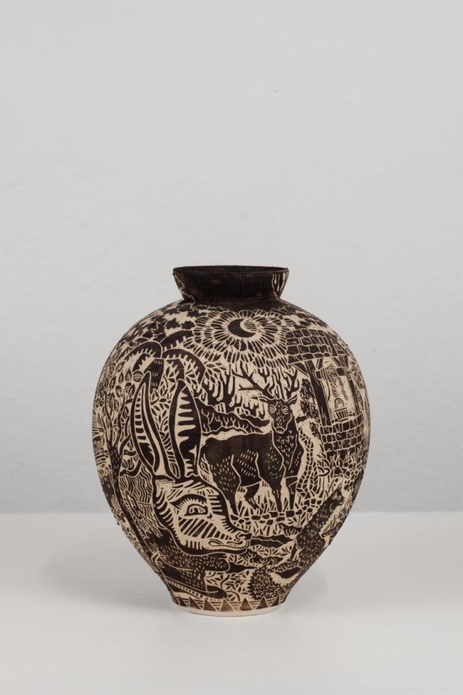 La superficie è rivestita e decorata con argilla selvatica e sabbia raccolte in campagna, materiali che conferiscono al corpo ceramico una texture materica e una cromia profonda, terrosa, quasi notturna. La decorazione è eseguita a sgraffito: il segno inciso costruisce una narrazione continua che avvolge il vaso