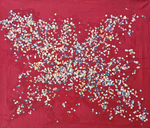 Acrilico, coriandoli e plastica su tela, cm 60x70
