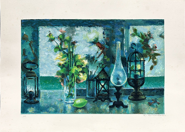 ROMANO CONVERSANO, litografia su cartoncino, cm 70x90x0,5, kg 0,5. Al fronte: tiratura P.D.A in basso a sinistra, firma in basso a destra. Al verso: firma. L'opera presenta fioritura. Opera senza cornice