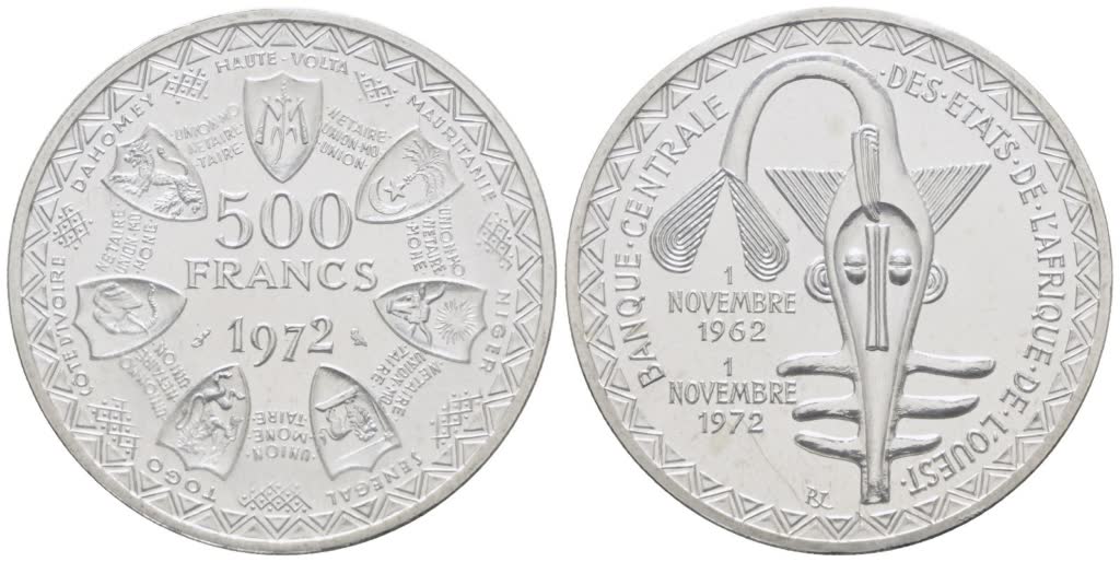AFRICA OCCIDENTALE CFA. 500 franchi 1972, KM E7; Ag; 25gr. FDC