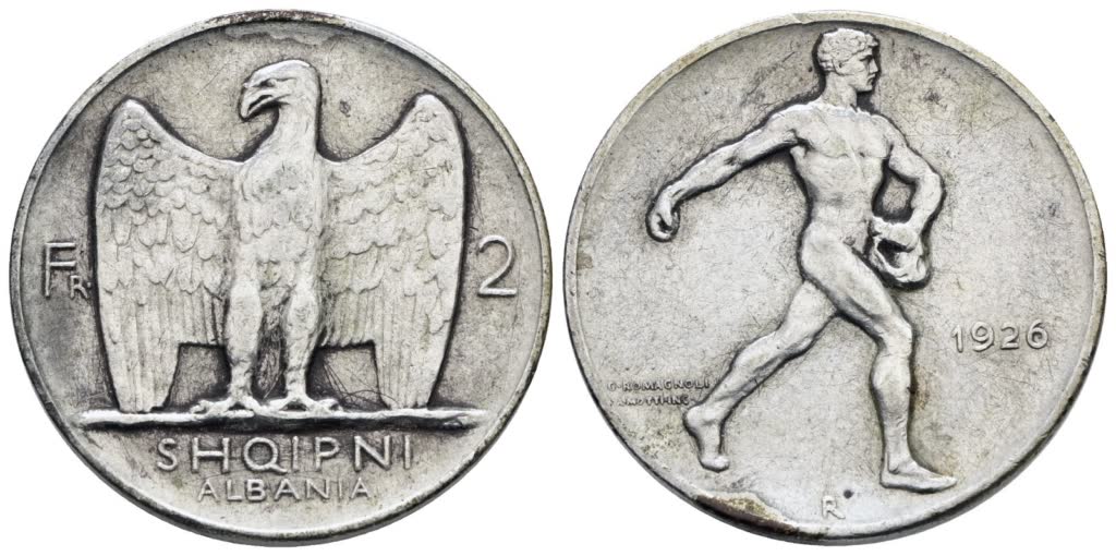 Lotto 2 | ALBANIA. 2 franga 1926. Ag; 10gr; KM 7; Raro; BB/SPL, leggera traccia di appiccagnolo.