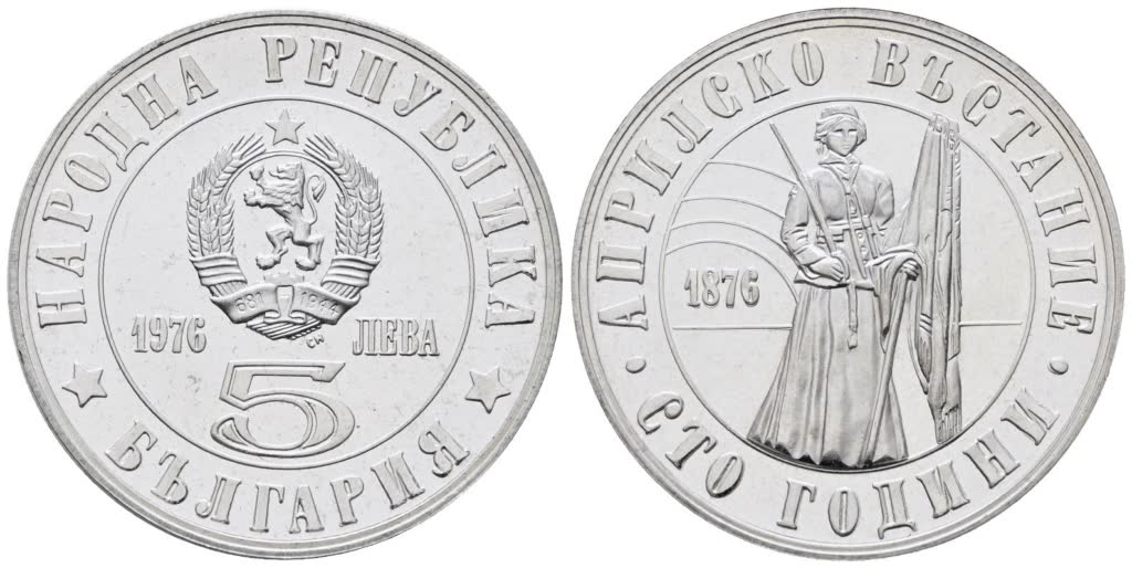 BULGARIA. 5 leva 1976 "centenario rivolta di aprile". KM 97; Ag; 20,5gr. PROOF