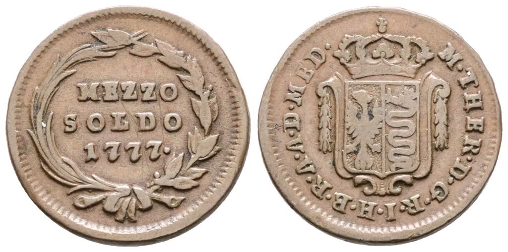 MILANO, Maria Teresa d'Asburgo (1740-1780). Mezzo soldo 1777. Cu; 3,9gr; MIR 441/1; BB+