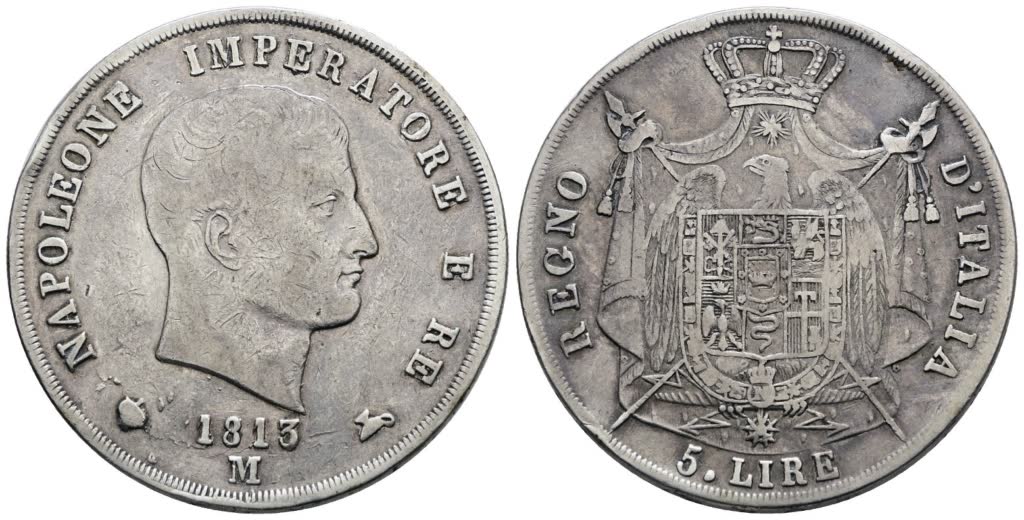 MILANO. Regno d'Italia. Napoleone I (1805-1814). 5 lire 1813 "puntali aguzzi". Ag; 25gr; Gig.115; Raro; Q.BB