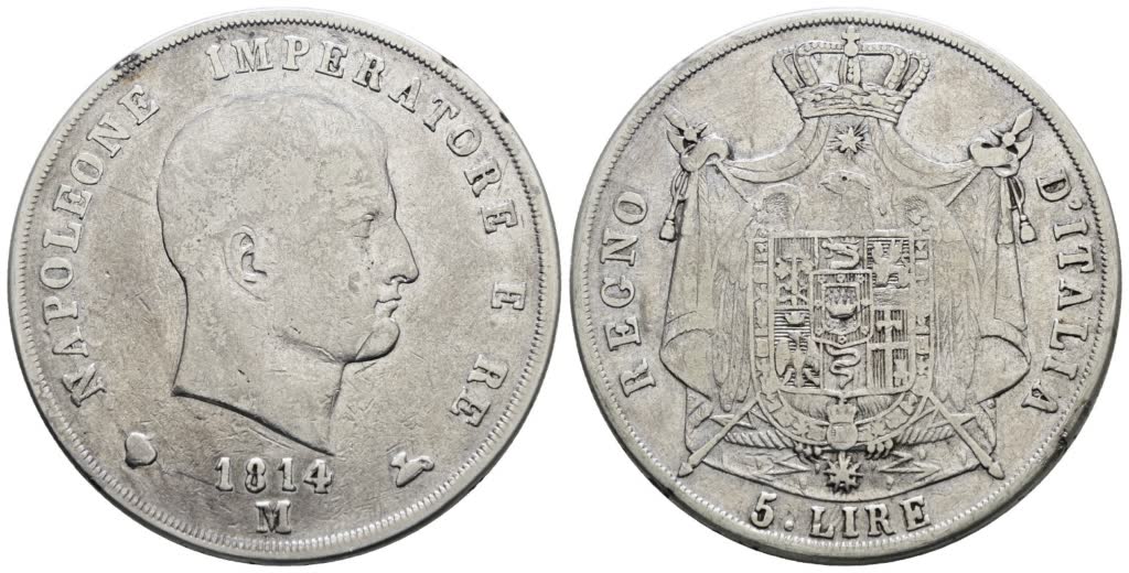 MILANO. Regno d'Italia. Napoleone I (1805-1814). 5 lire 1814 "puntali sagomati". Ag; 25gr; Gig.124; Q.BB
