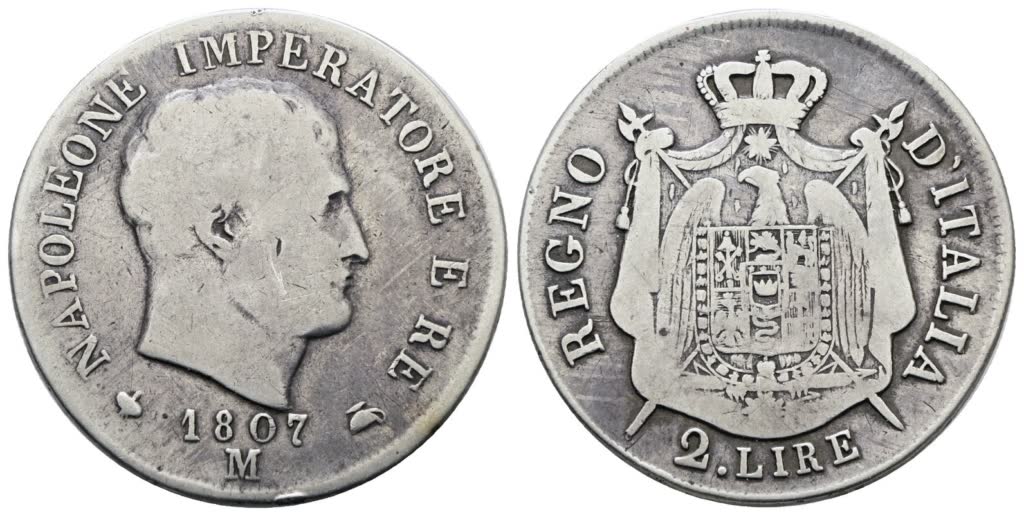 Lotto 366 | MILANO. Regno d'Italia. Napoleone I (1805-1814). 2 lire 1807 "data con cifre spaziate". Ag; 10gr; Gig.125a; RR; MB