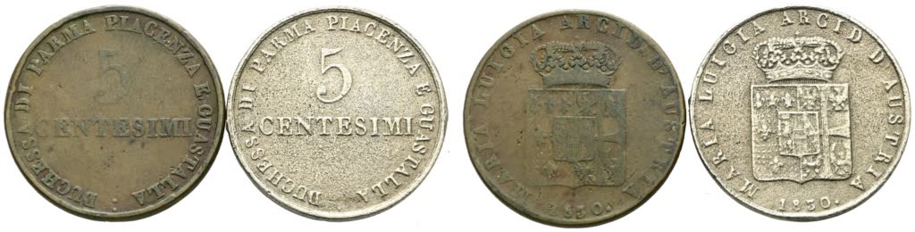 PARMA. Maria Luigia d'Austria (1815-1847). 5 centesimi 1830. Lotto di 2 esemplari di cui uno argentato (probabile falso). Conservazioni varie. Cu; Gig. 14