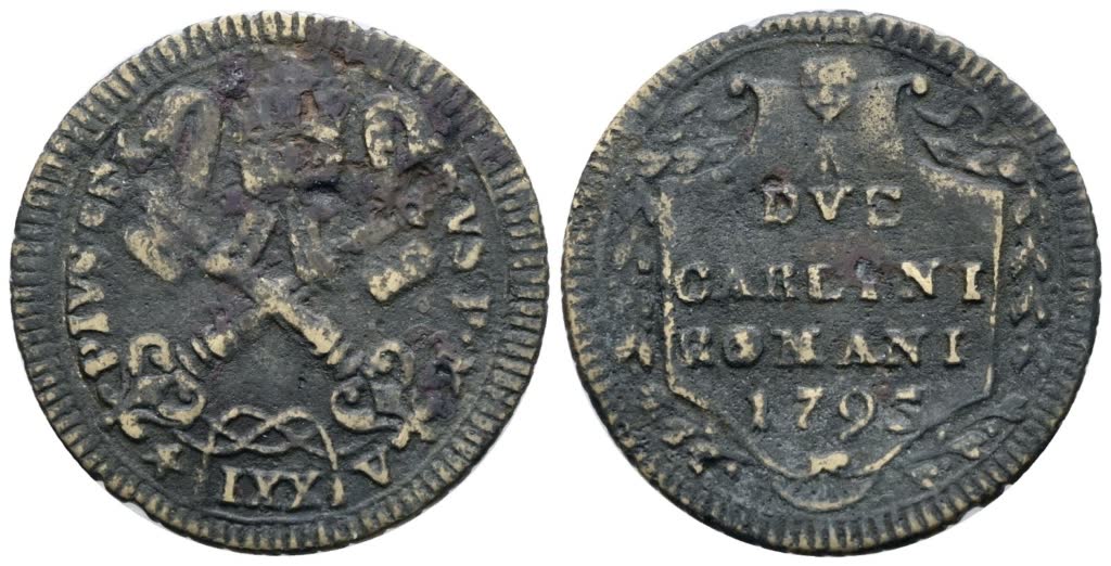 STATO PONTIFICIO. ROMA. Pio VI (1775--1799) 2 carlini romani 1795. Mi; 5,4gr; MIR 2781/5; MB