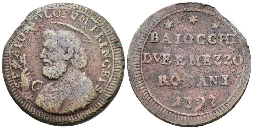 Lotto 626 | STATO PONTIFICIO. ROMA. Pio VI (1775-1799). Sampietrino da 2,5 baiocchi 1797. Cu; 16,9gr; Munt.99a; MIR 2797/3; NC; MB+