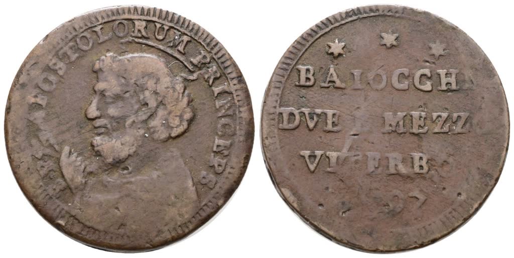 Lotto 636 | STATO PONTIFICIO. VITERBO. Pio VI (1775-1799). Sampietrino da 2,5 baiocchi 1797. Cu; 16,9gr; Munt.425; MIR 3021/2; MB/BB