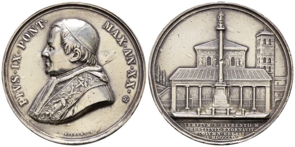 STATO PONTIFICIO. PIO IX (1846-1878). Medaglia a. XX 1865 S. Lorenzo fuori le Mura Ag. 33,7gr. 43,5mm. Rara. BB+
