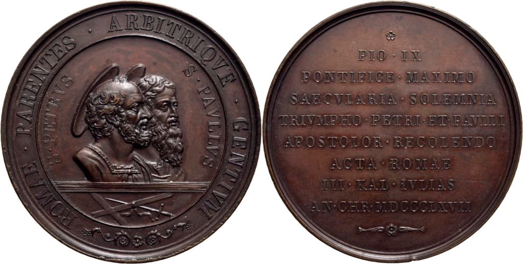 STATO PONTIFICIO. Pio IX (1846-1878). Medaglia 1867 18° Centenario del martirio di Pietro e Paolo Ø: 48 mm. (AE g. 48) qFDC
