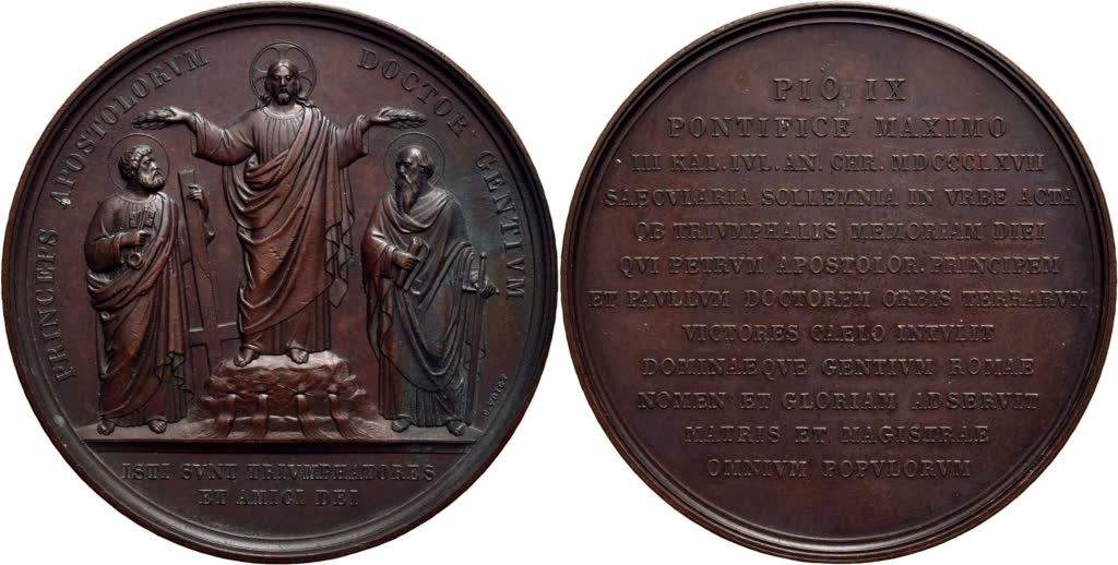 STATO PONTIFICIO. Pio IX (1846-1878). Medaglia 1867 18° Centenario martirio di Pietro e Paolo Ø: 70 mm. (AE g. 118) RR qFDC
