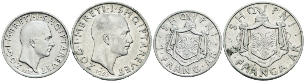 ALBANIA. Zog I (1928-1939). Interessante lotto di 2 monete da 1 e 2 franga 1935. Ag; Conservazioni varie.