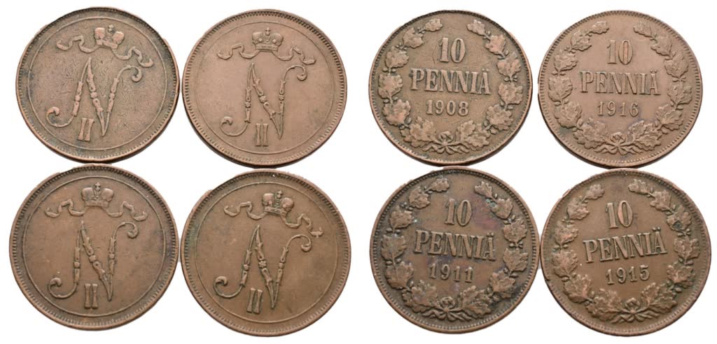 FINLANDIA. Nicola II (1894-1917). Lotto di 4 monete da 10 pennia 1908, 1911, 1915, 1916. Cu. Conservazioni varie.