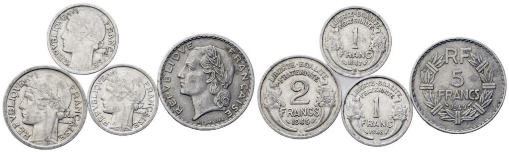 Lotto 1227 | FRANCIA. IV Repubblica. 5 franchi 1949, 2 franchi 1945, 1 franco 1943, 1947. Lotto di 4 esemplari.