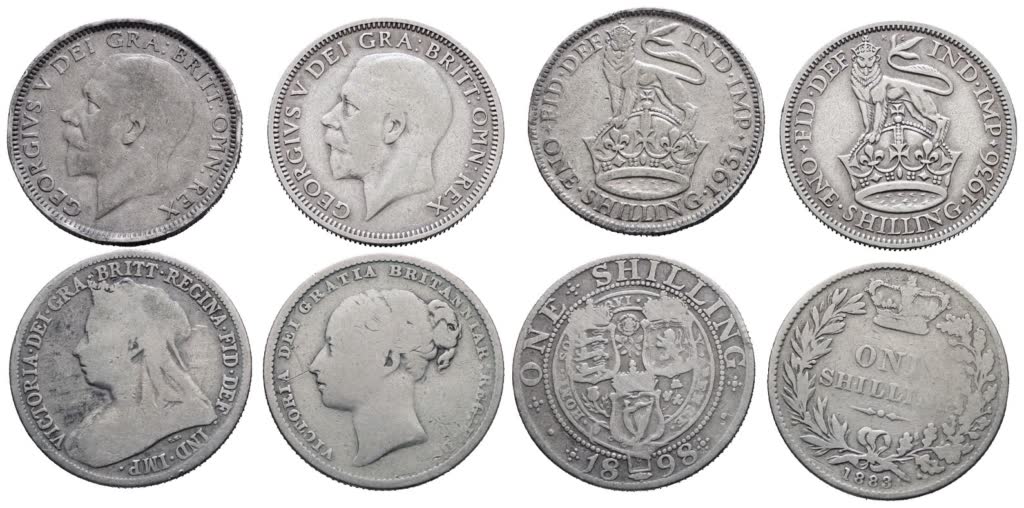 INGHILTERRA. Lotto di 4 monete. 1 shilling 1883, 1898, 1931, 1936. Ag Conservazioni varie.
