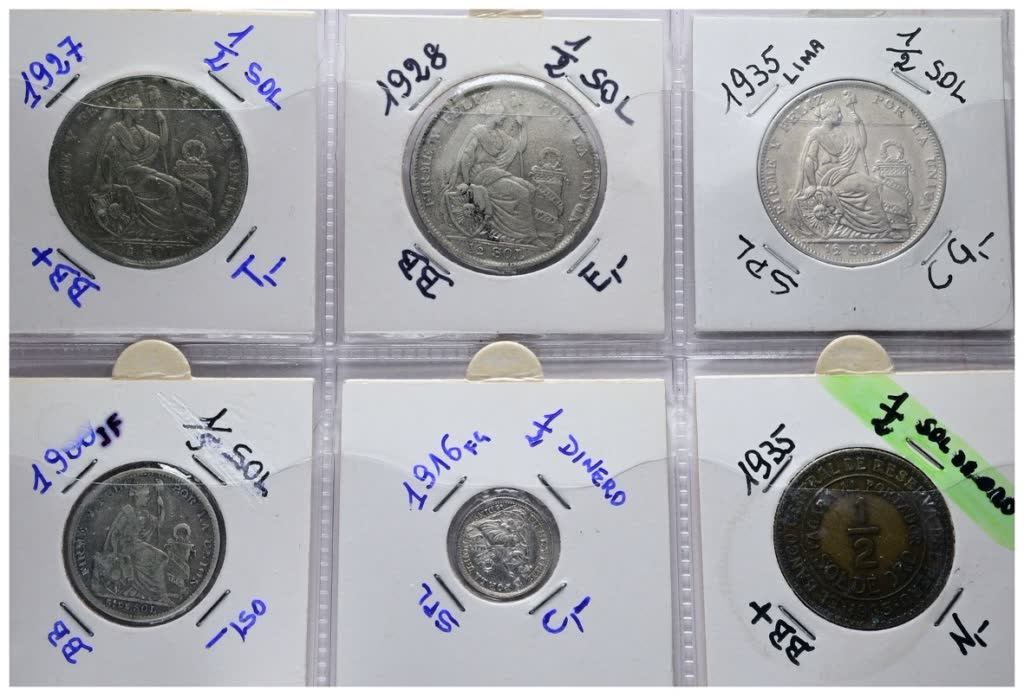 PERU'. Lotto di 6 monete, anche in Ag. Metalli, nominali, date e conservazioni varie.