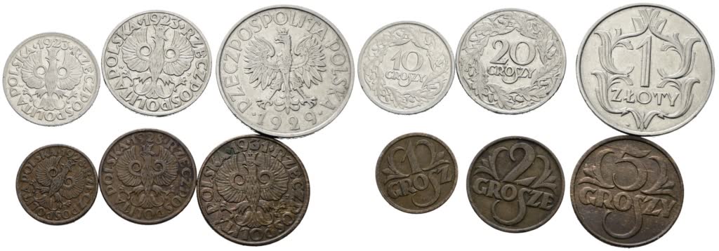 POLONIA. Lotto di 6 monete da 1, 2, 5, 10, 20 groszy, 1 zloty. Date e conservazioni varie.
