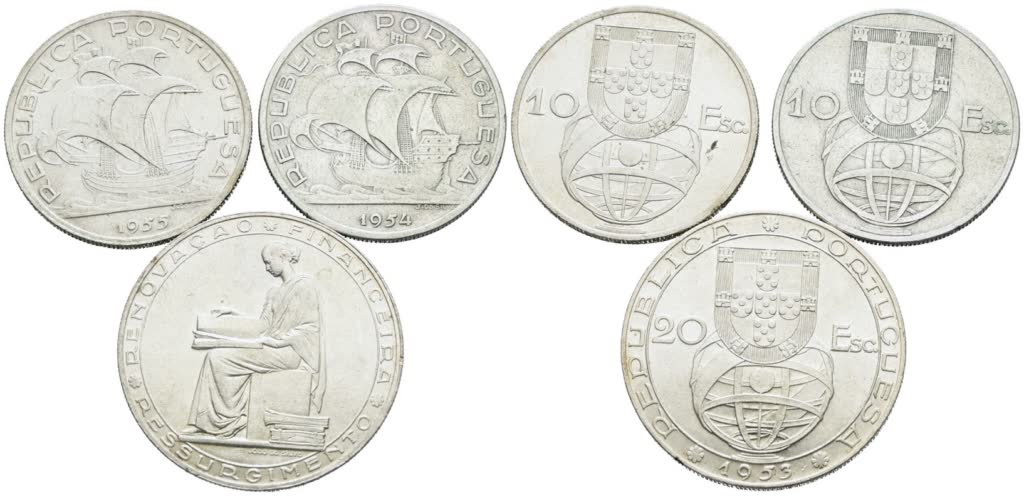PORTOGALLO. Interessante lotto di 3 monete da 20 escudos 1953, 10 escudos 1954, 1955. Ag; Conservazioni varie.