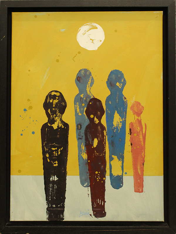 CORRADO ZANI, "Guardano la luna", 2010, tecnica mista su tela, cm 70x50, con cornice 78x57x4,5, peso 2 kg. Al fronte: firma al centro in basso. Al verso: firma, anno, titolo. Opera con certificato di provenienza della Daliano Ribani Arte. Opera con cornice.