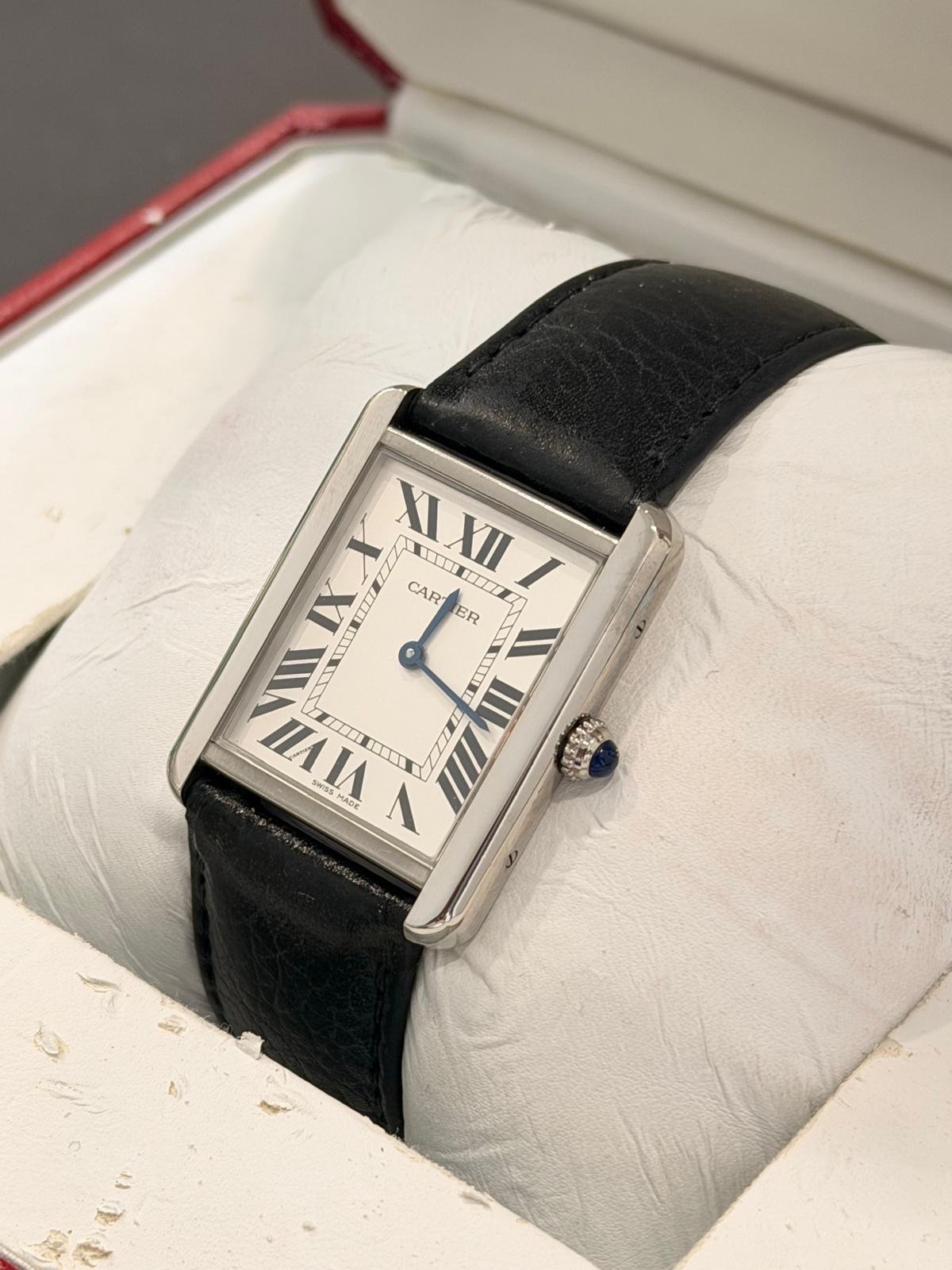 Marca Cartier Modello (Orologio) Tank Solo Numero di referenza WSTA0028 Carica Quarzo Materiale della cassa Acciaio Materiale cinturino Pelle Anno di produzione 2018 Condizione Usato (Ottimo) L'articolo presenta segni di usura lievi, come ad esempio graffi leggeri, ma non percepibili al tatto. Corredo documenti originali, no box Carica Quarzo Cassa Materiale della cassa Acciaio Diametro 34.8 x 27.4 mm Impermeabile 3 ATM Materiale lunetta Acciaio Vetro Vetro zaffiro Quadrante Bianco Numeri sul quadrante Romani Cinturino Materiale cinturino Pelle Colore cinturino Nero Chiusura Déployante Materiale chiusura Acciaio - COMMISSIONE D’ASTA 25%