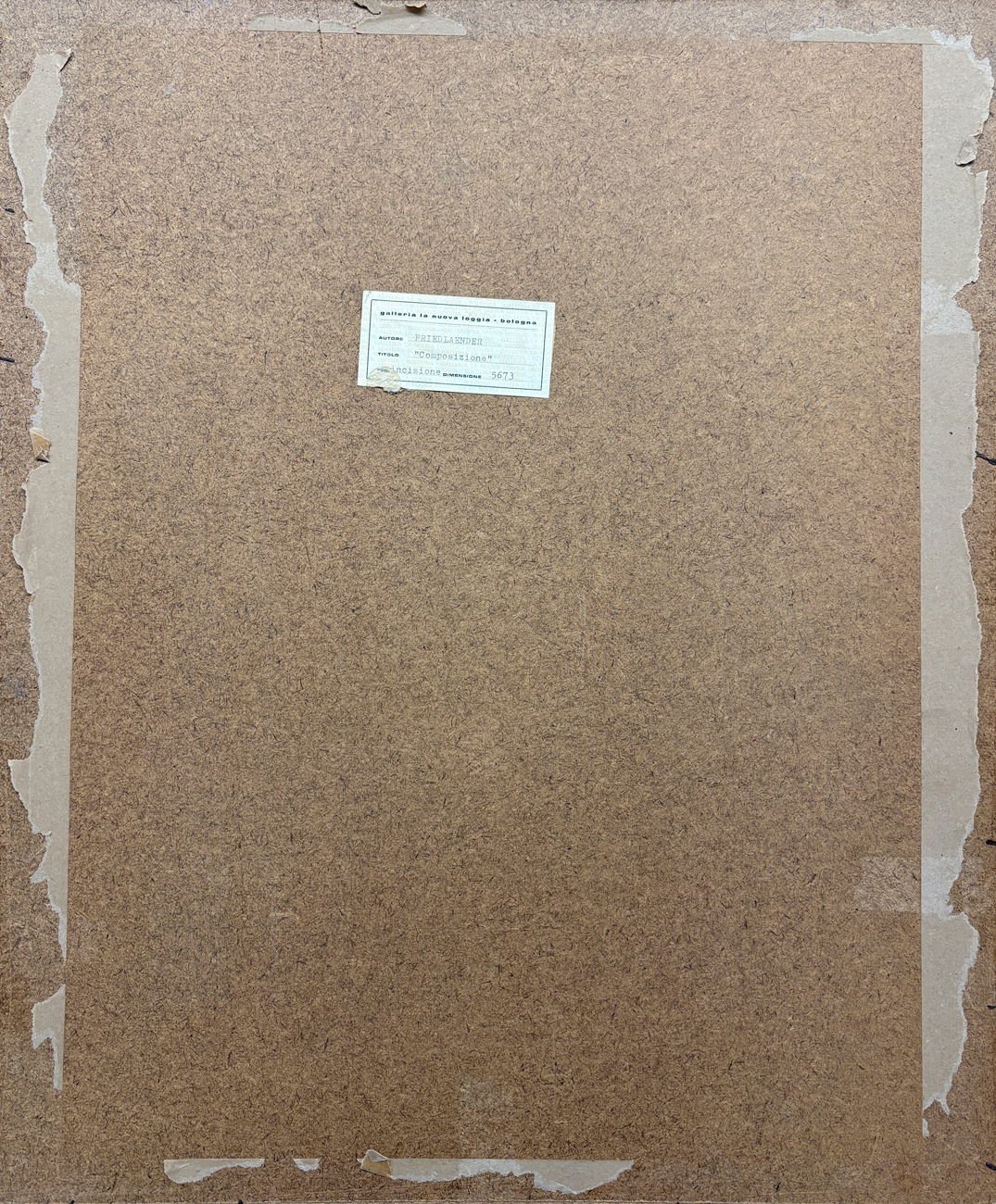 Etichetta della Galleria La Nuova Loggia (BO) al retro della masonite protettiva