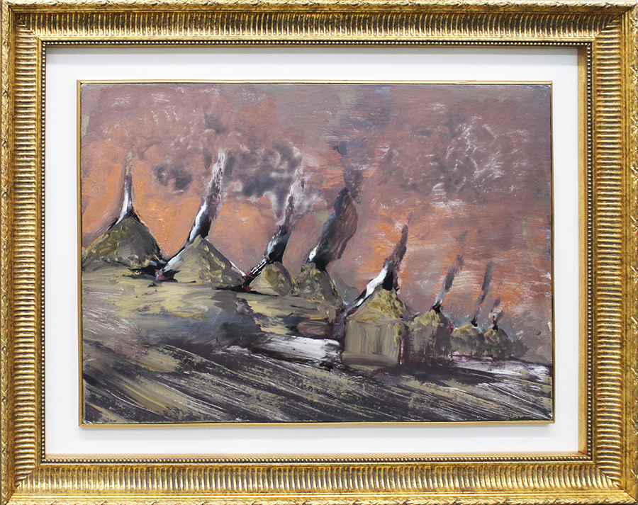 SERGIO VACCHI, "Otto camini nel tramonto di Roma", 1980, olio su tela, dim 50x70 cm. Al verso: titolo, firma, anno in alto al centro. Opera con cornice.