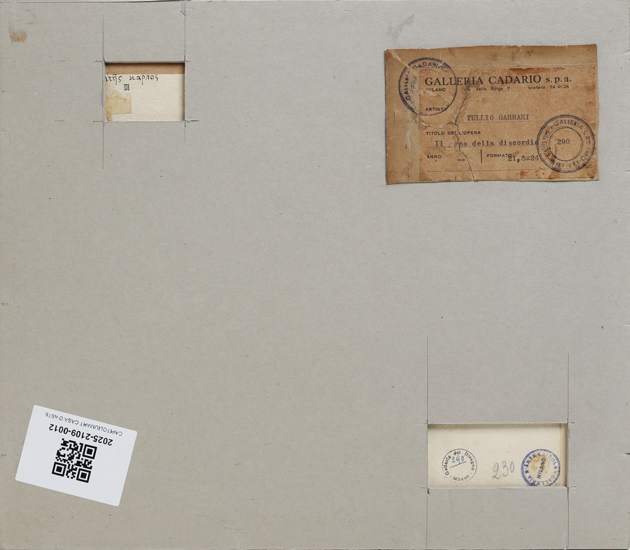 sul retro: titolo, timbro Galleria del disegno, Milano, timbro Galleria d'arte Cairola, Milano e etichetta Galleria d'arte Cadario, Milano.