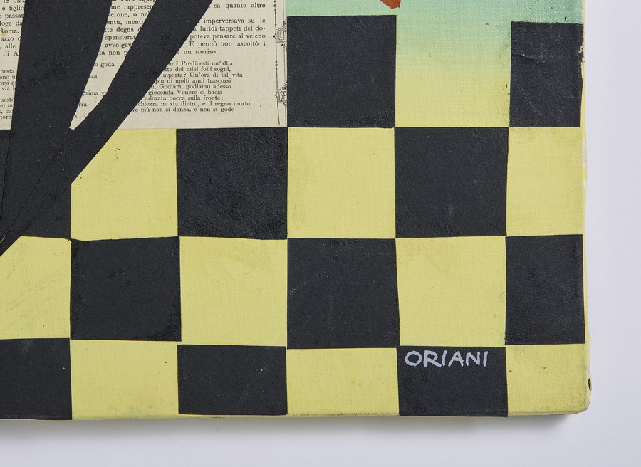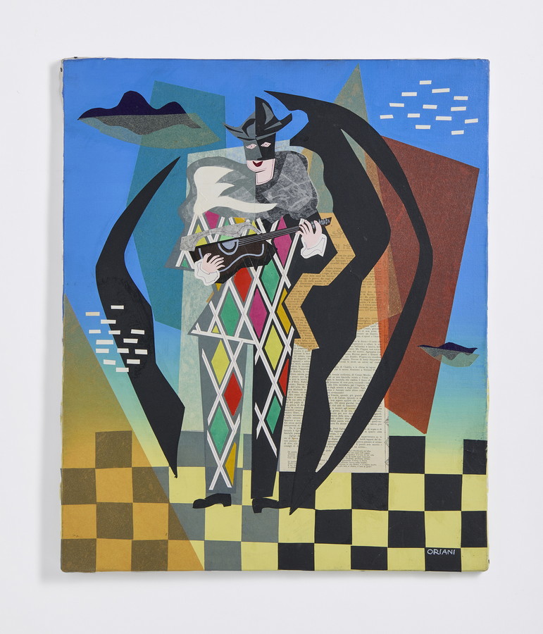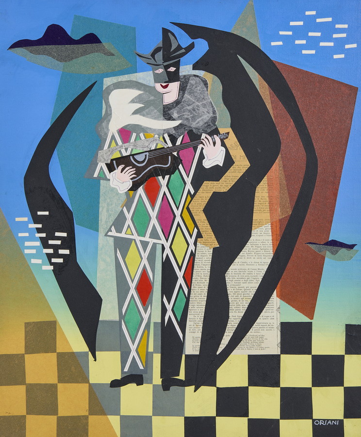 ORIANI PIPPO (1909 - 1972) ARLECCHINO CHE SUONA LA CHITARRA . Collage su tela. Cm 50,00 x 60,00. firma