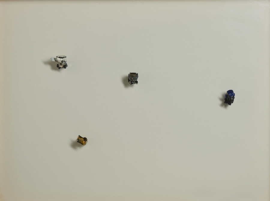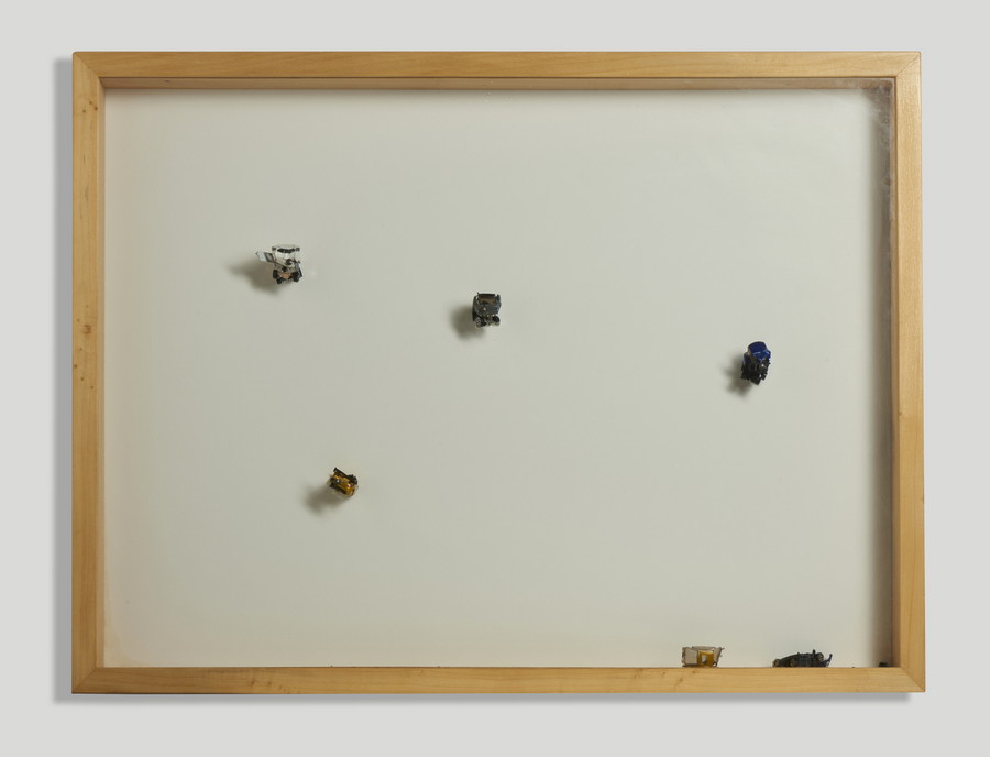 BAZZANA MICHELE (n. 1979) CRASH #03, 2009. chiodi di acciaio, automobili giocattolo, cornice a cassetta. Cm 102,00 x 77,00 x 9,00. l'opera è accompagnata da certificato di autenticità dell'artista a cura della Galleria Spazio A, Pistoia. Cornice presente