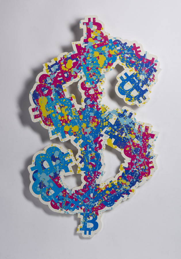 AIIROH (n. 1987) DOLLAR BITCOIN MULTICOLORED A408. 2022. Acrilico e tecnica mista su resina applicata su pannello. Cm 50,00 x 81,50 x 1,00. sul retro: firma spray