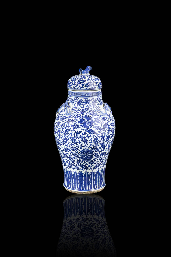 Vaso in porcellana bianca e blu con decori floreali e draghi a rilievo. Coperchio sormontati da cani di Pho, Cina dinastia Qing XVIII Sec.
