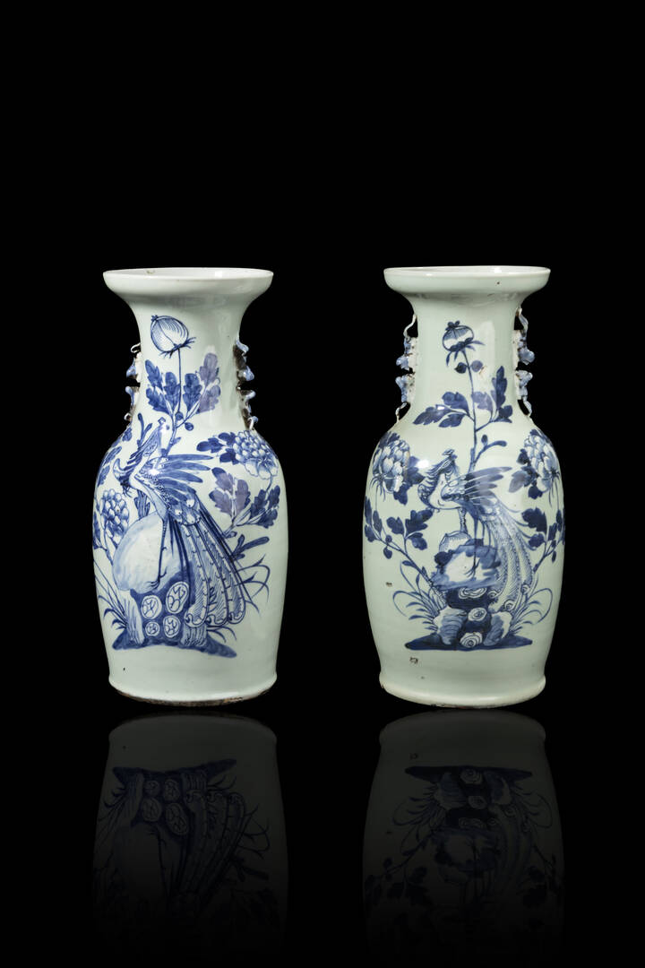 Coppia di vasi in porcellana bianca e blu, decorati con fenici, Cina dinastia Qing XIX Sec.