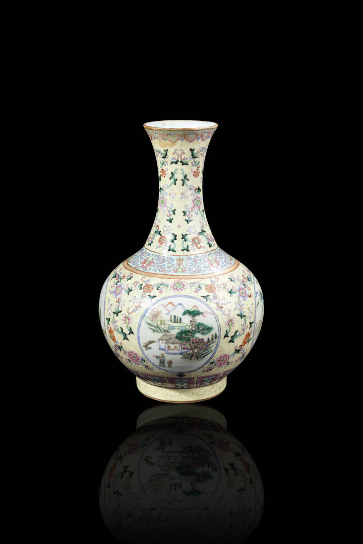Vaso in porcellana Famiglia Rosa decorato con paesaggi entro riserve. Cina Dinastia Qing epoca Guangxu (1871-1908).