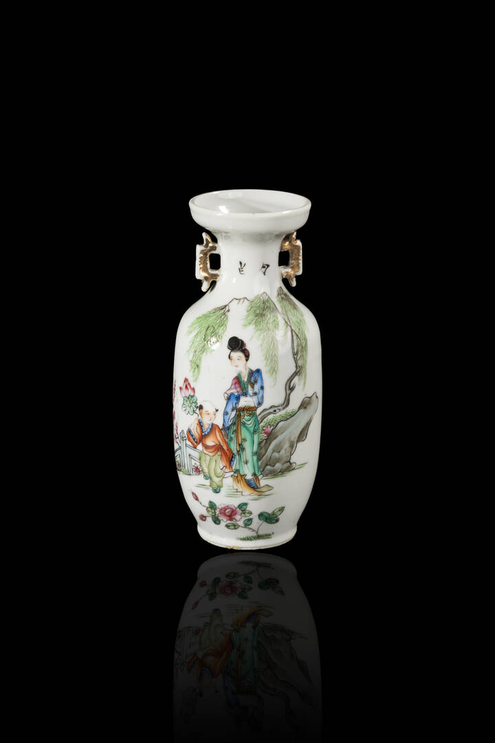 Vaso in porcellana Famiglia Rosa decorato con personaggi in giardino e scritte, Cina, Repubblica XX Sec.