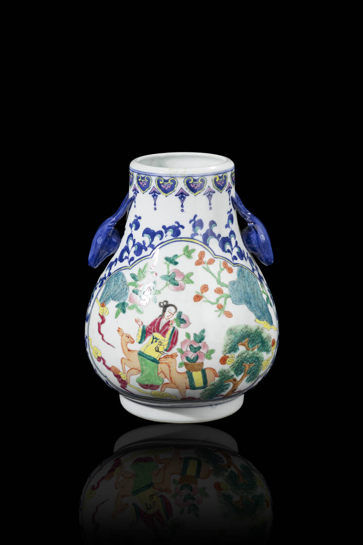 Vaso in porcellana Famiglia Rosa con manici zoomorfi decorato con figure entro riserve, Cina, Repubblica XX Sec.
