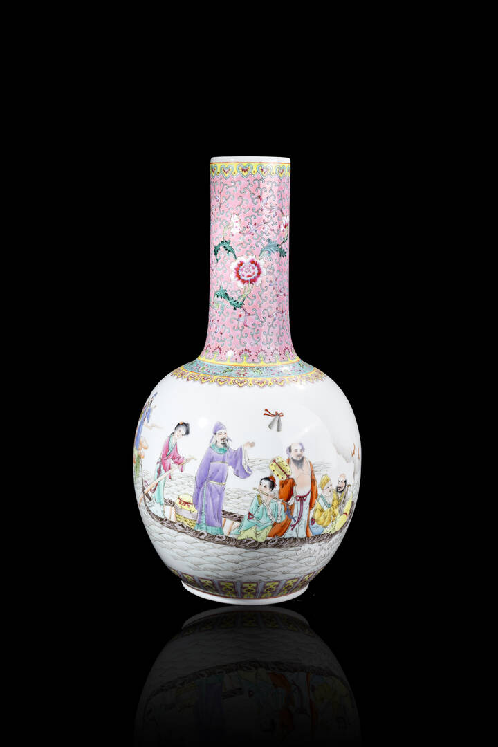 Vaso a pallone in porcellana Famiglia Rosa, decorato con personaggi su baca. Cina, Repubblica XX sec.