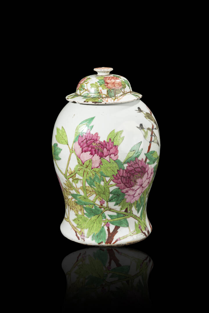 Poutiche in porcellana Famiglia Rosa decorata con peonie e uccelli, iscrizioni al retro, Cina dinastia Qing XIX Sec.