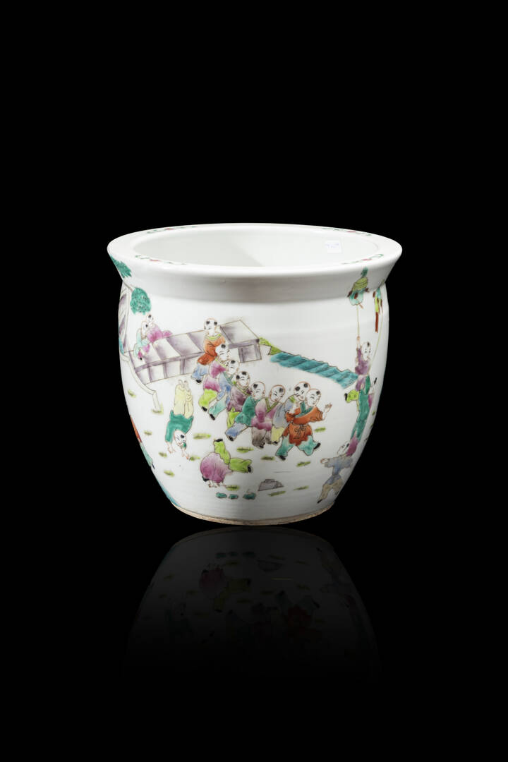 Vasca in porcellana Famiglia Rosa decorata con personaggi in giardino, Cina, Repubblica XX Sec.