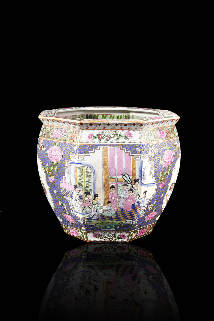Vasca in porcella Famiglia Rosa forma ottagonale decorata con personaggi e fenici entro riserve.
