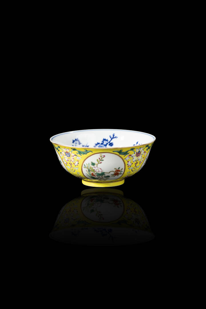 Ciotola in porcellana Famiglia Rosa decorata con fiori entro riserve a fondo giallo, Cina dinastia Qing XIX Sec.