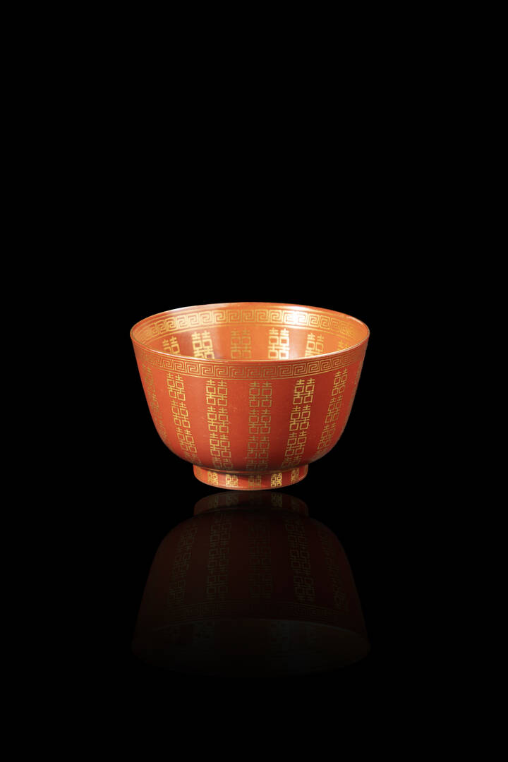 Ciotola in porcellana Famiglia Rosa decorata con motivi arcaici in oro su fondo rosso, Cina, Repubblica XX Sec.